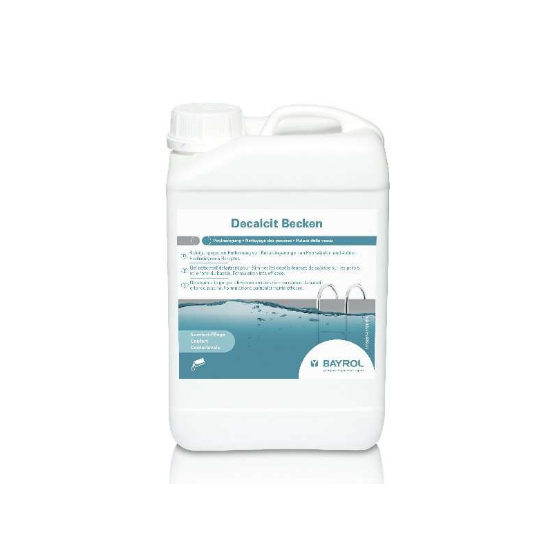 Decalcit Becken ist ein spezieller saurer Reiniger, der vorrangig bei der Frühjahrsreinigung des entleerten Beckens angewendet wird, um Kalkablagerungen an Poolwänden und -böden zu entfernen. Die dickflüssige Rezeptur von Decalcit Becken verlängert die Einwirkzeit und hat zur Folge, dass auch hartnäckige Kalk-, Metall- (Eisen) sowie Schmutzablagerungen erfolgreich beseitigt werden.
