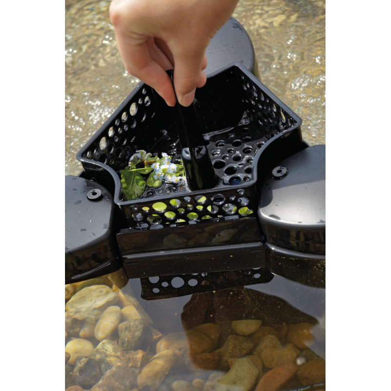 Der SwimSkim 50 kann entweder am Teichgrund oder mit den mitgelieferten Erdspießen am Teichrand fixiert werden.