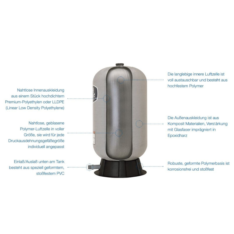 Die Eigenschaften und Vorzüge unserer WM-Serie sind von Stahltanks unerreicht. Von der korrosionsfreien Komposit Konstruktion, über geringes Gewicht, einfache Wartung bis hin zur kostengünstigen Installation, sind Druckausdehnungsgefäße der WM-Serie die erste Wahl des Profis.